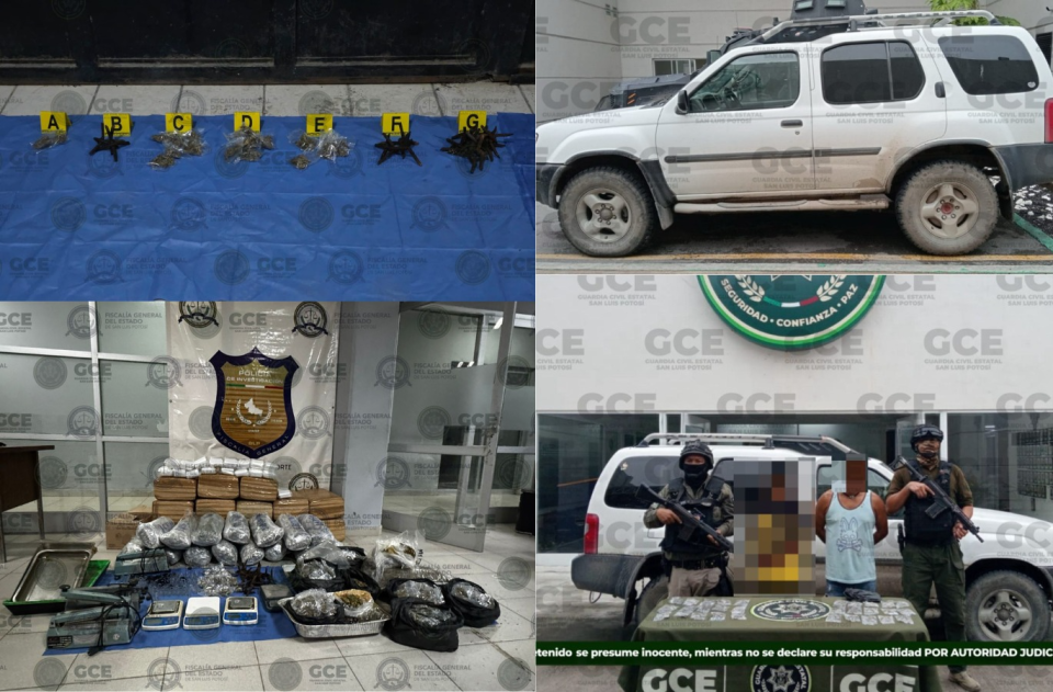 En Ciudad Valles, la GCE detuvo a dos personas y, posteriormente, en coordinación con la FGE, decomisó aproximadamente 154 kilogramos de marihuana y artefactos conocidos como “ponchallantas”.