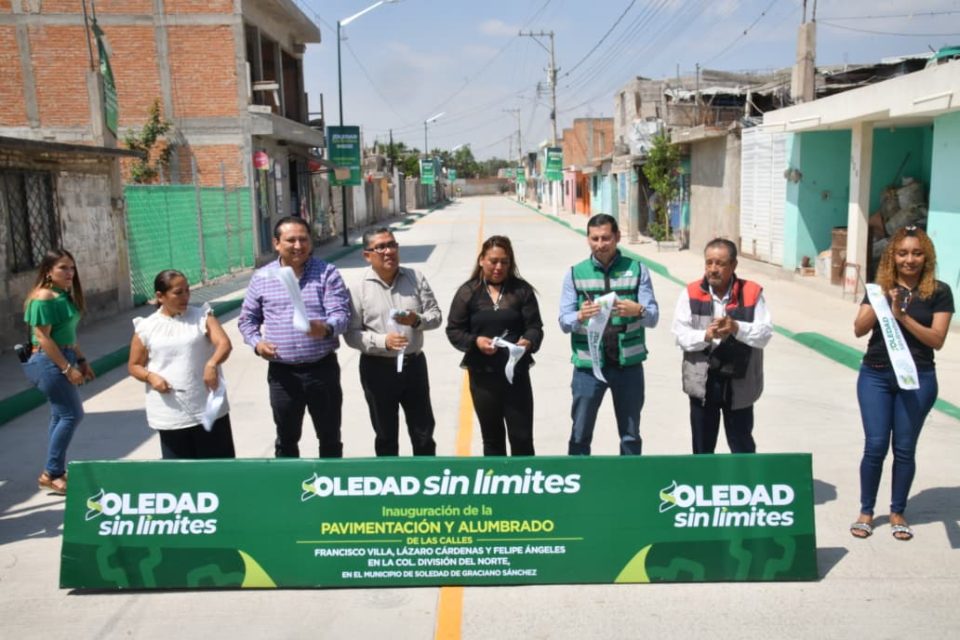 Juan Manuel Navarro Muñiz, Alcalde de Soledad de Graciano Sánchez, inauguró este miércoles la pavimentación y alumbrado de las calles Francisco Villa, Lázaro Cárdenas y Felipe Ángeles en la colonia División del Norte, marcando un antes y un después para más de 4 mil 300 personas que hoy ven transformado su entorno; con una inversión superior a los 10 millones de pesos, la obra termina con décadas de espera y con condiciones deplorables de estos caminos. Ahora, la intervención municipal ofrece seguridad, dignidad urbana y armonía para niños, niñas, jóvenes y adultos que tienen calles idóneas para vivir mejor.